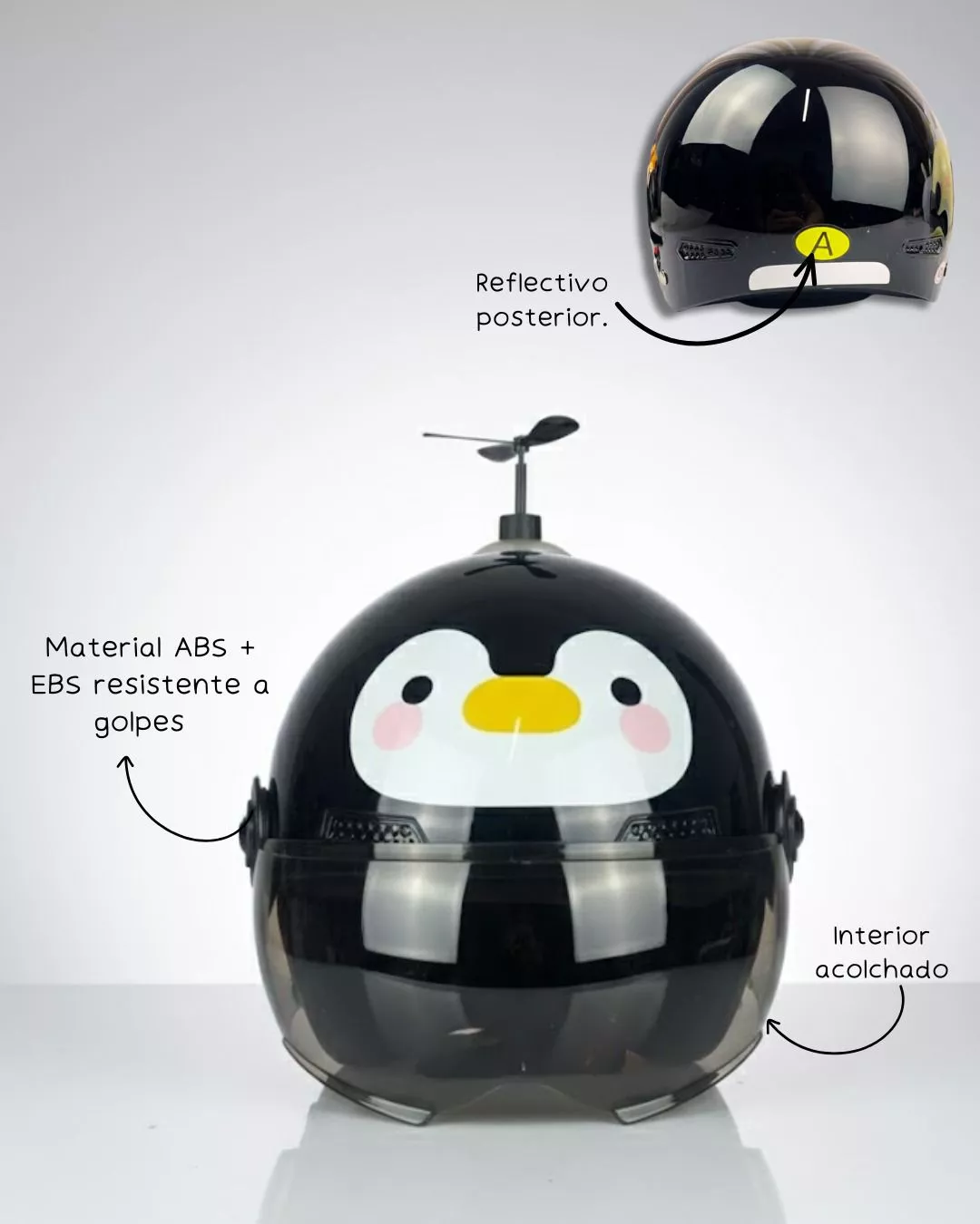 Fabricado en material ABS resistente a golpes, ofrece una protección adecuada ante impactos, ayudando a cuidar la cabeza del niño durante el uso diario. Cuenta con visera frontal que protege el rostro del viento y partículas, además de un interior acolchado que brinda mayor comodidad.