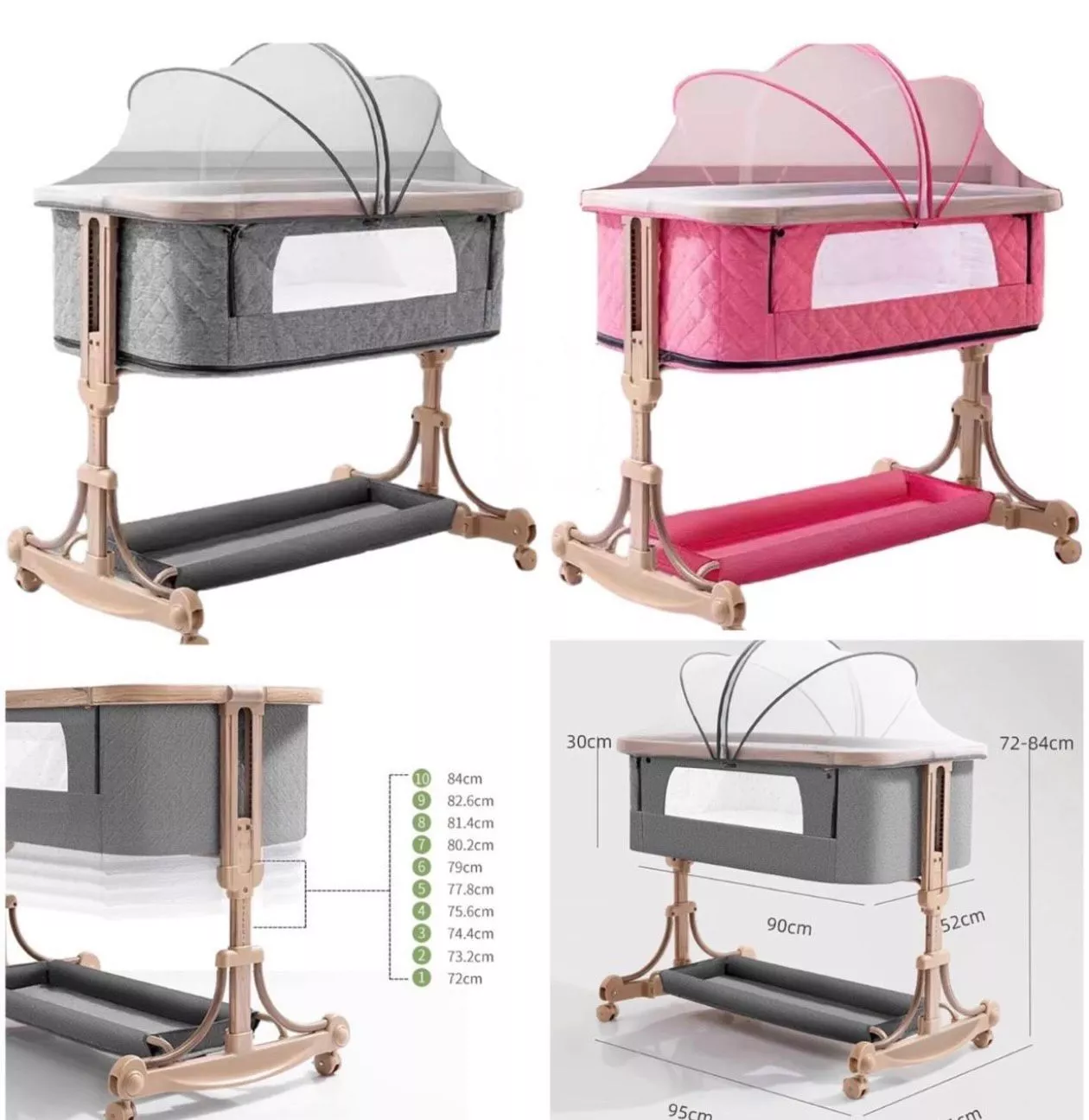 Cuna colecho para bebé ajustable en altura, con ruedas, mosquitero y diseño cómodo para un descanso seguro junto a los padres.